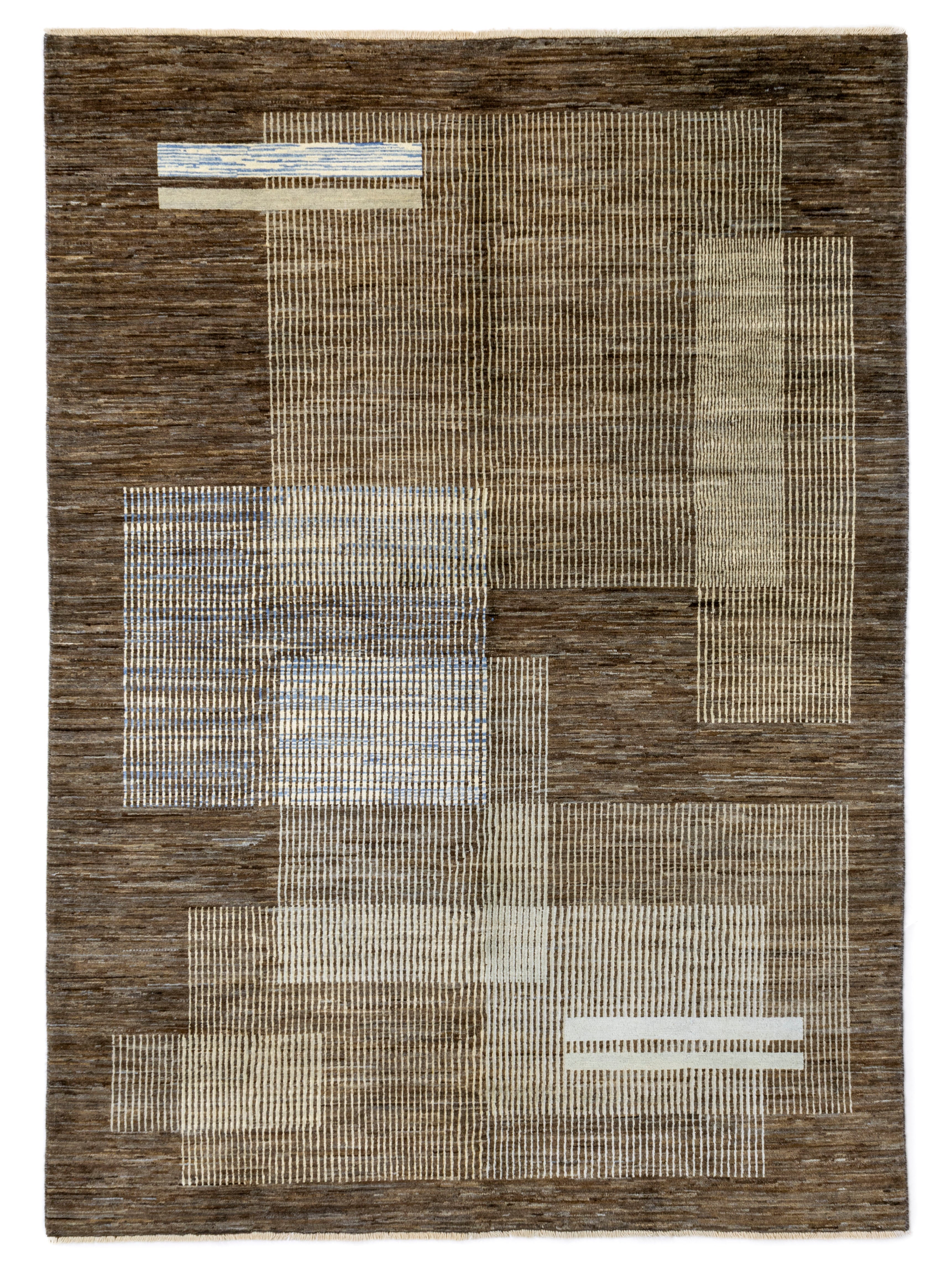 het design van het Gabah Bamiyan kleed heeft een artistieke uitstraling. Verschillende witte, groene en grijze design vlakken zitten op een stijlvolle bruine achtergrond. De Gabah Bamiyan is de blikvanger van de kamer.